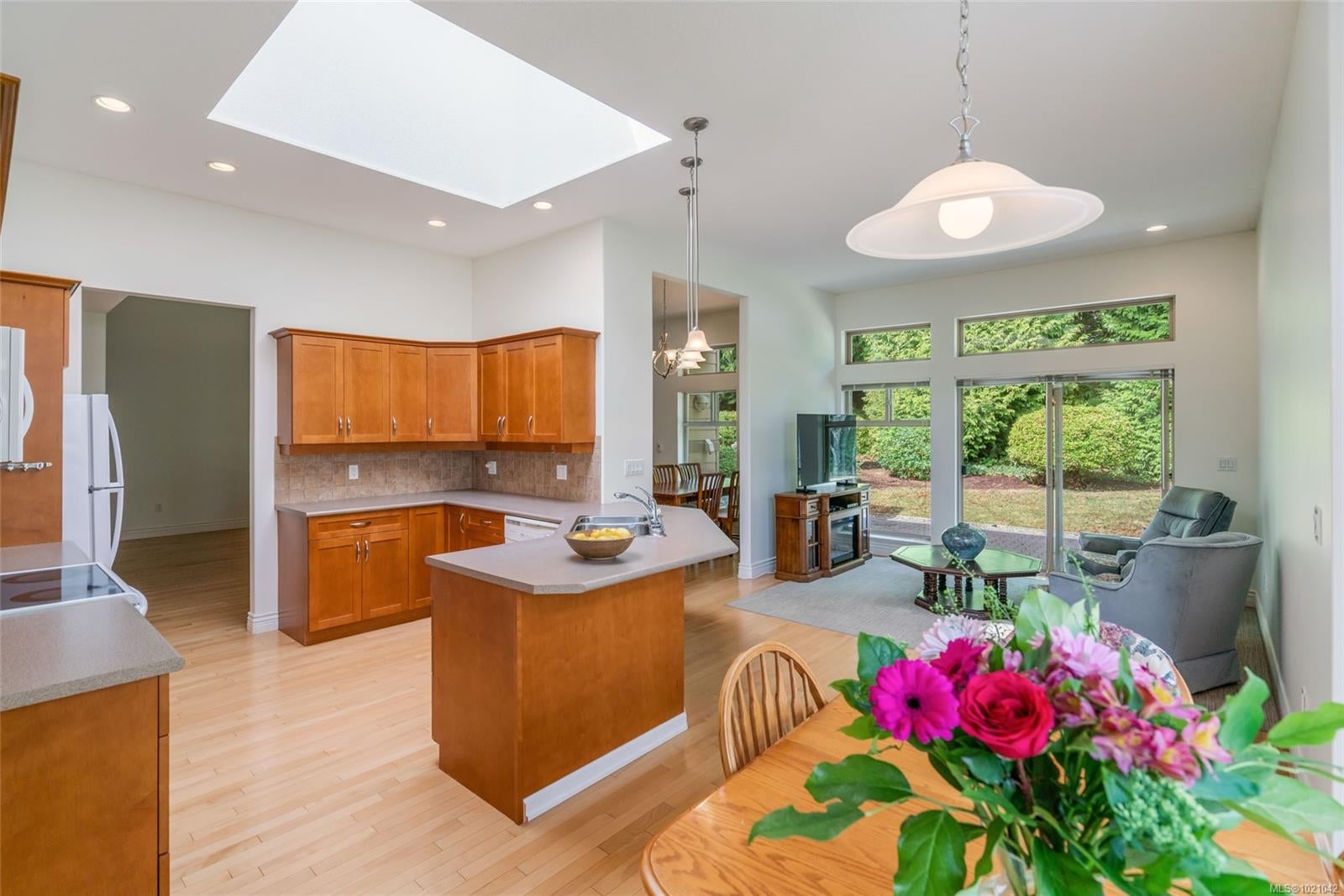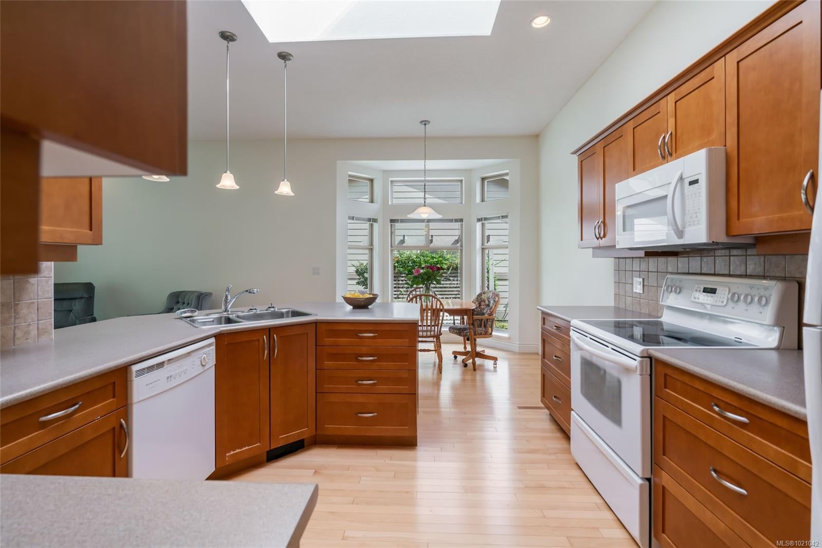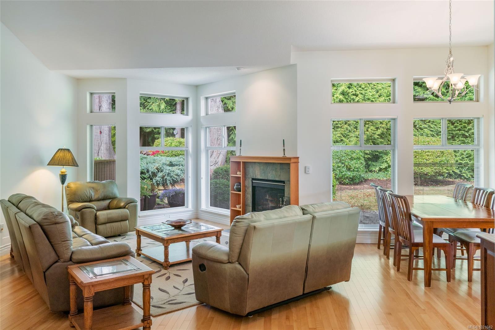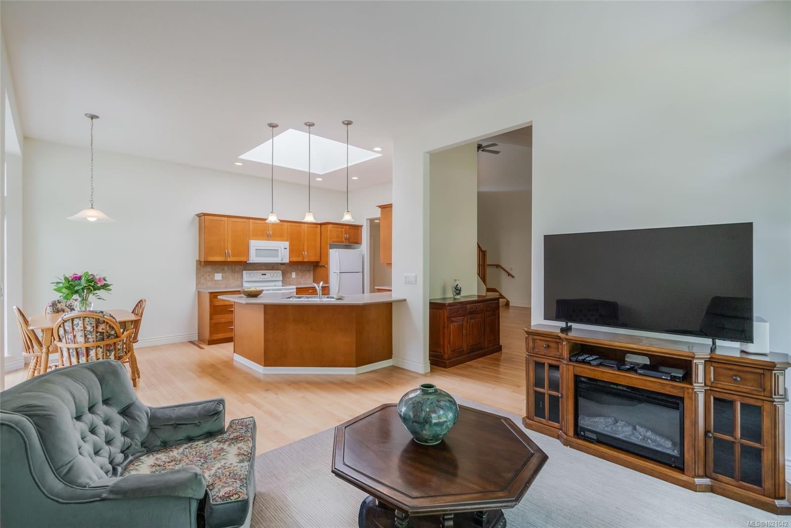 Discover bright, easy living in this spacious and well-maintained 2-bedroom, 2-bath townhome, perfectly suited to the Vancouver Island lifestyle. Hardwood floors, tiled entry, vaulted ceilings and skylights create an airy, light-filled feel. The open living and dining area features a cozy fireplace and space to showcase your art. Maple kitchen cabinetry and a family room lead to a large, private patio and garden area backing onto Morningstar Golf Course with gas BBQ hookup. The versatile loft includes a built-in wall unit and Murphy bed. A generous primary suite offers a 5-piece ensuite with soaker tub, walk-in shower, and walk-in closet. Large laundry room with sink and storage, second bedroom with adjacent bath, double garage, updated furnace (2019), hot water tank (2020), fresh paint, and cleaned carpets. No Poly-B plumbing. Close to amenities and ideal for relaxed Island living.